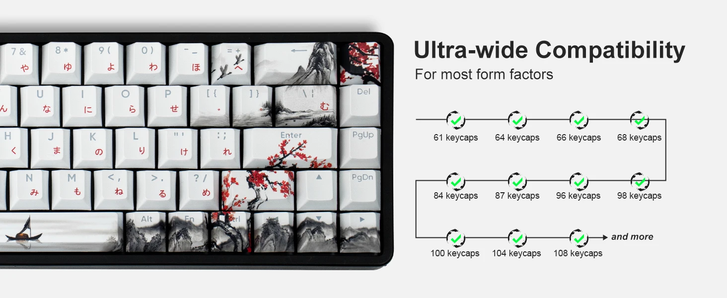 【Widely Compatible】This custom keycap set contains 127 keys. it can fit most 60%/65%/75%/80%/96%/100% (61/64/68/84/75/87/96/980/104/108) keyboards like anne pro 2, tkl rk68, rk84, etc.
